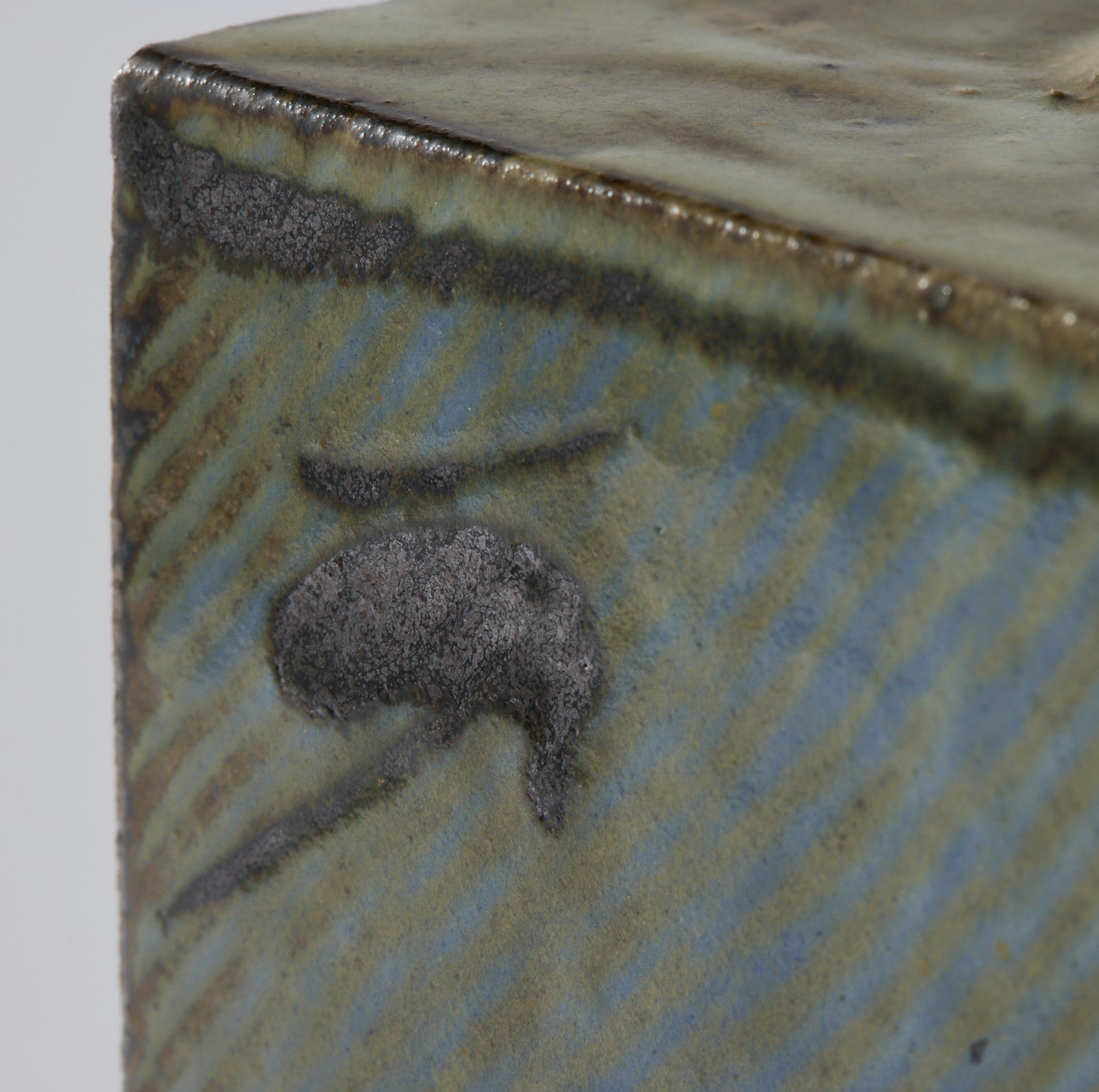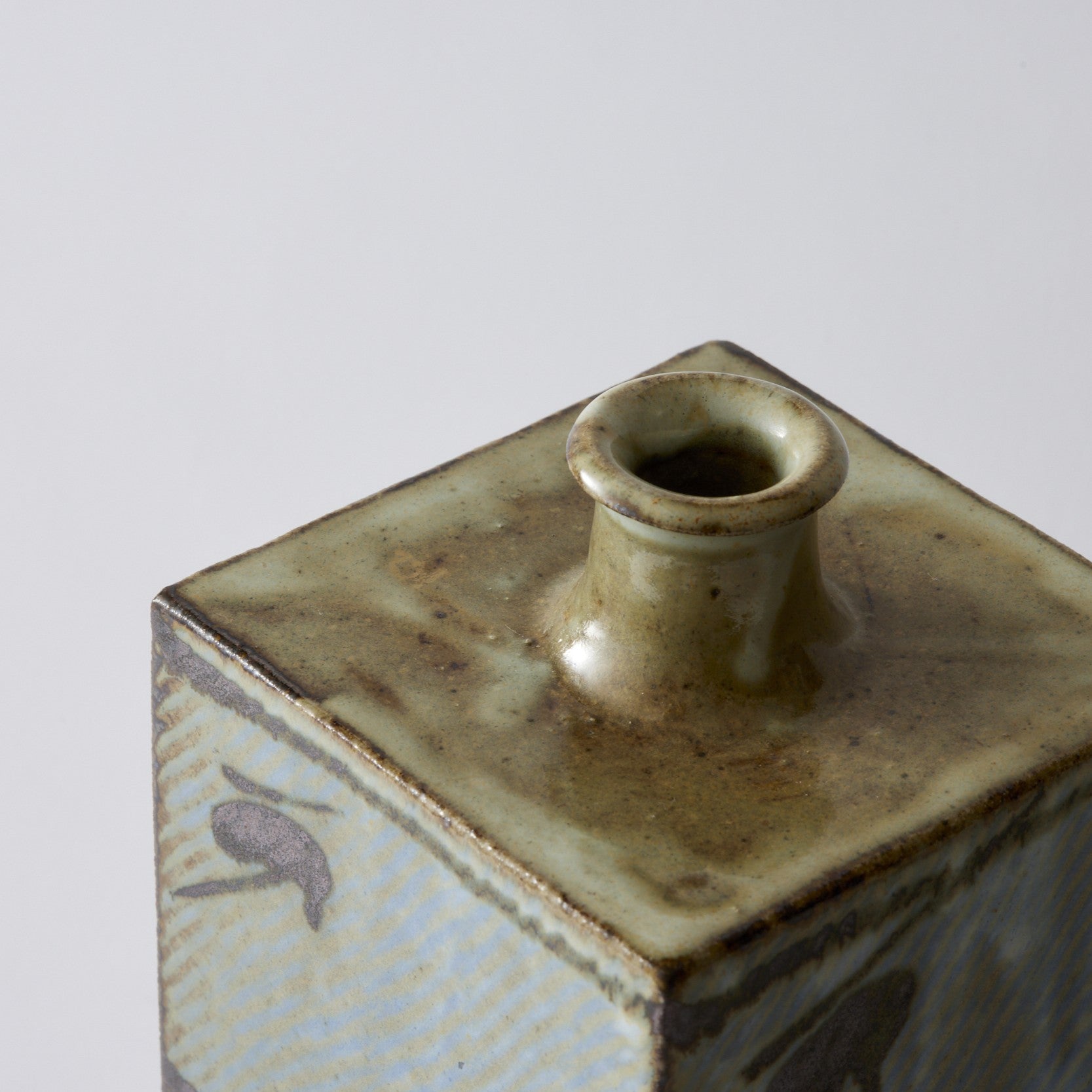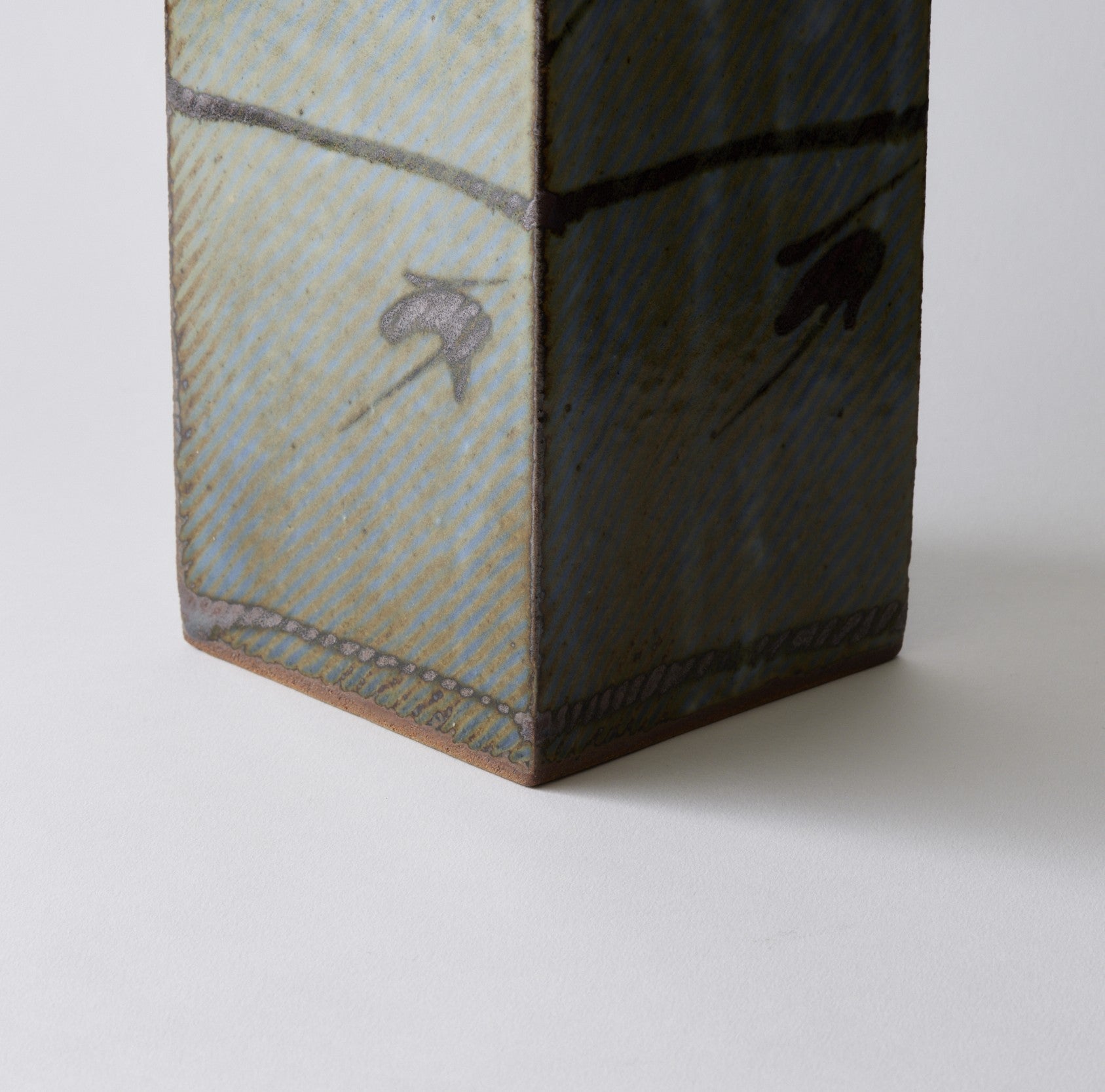 This square jar harmonizes intricate Jōmon inlay with subdued earth glaze, embodying both tranquility and strength.