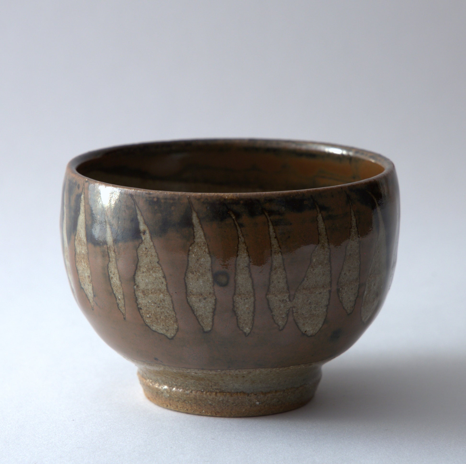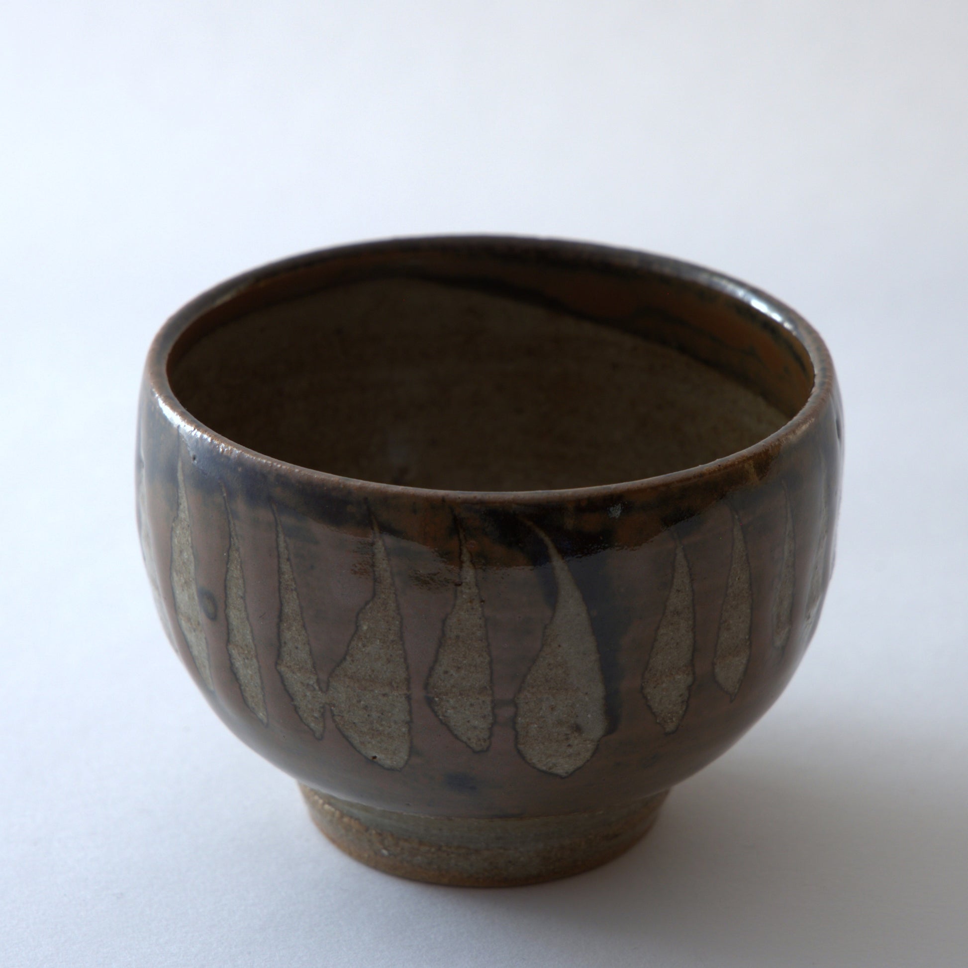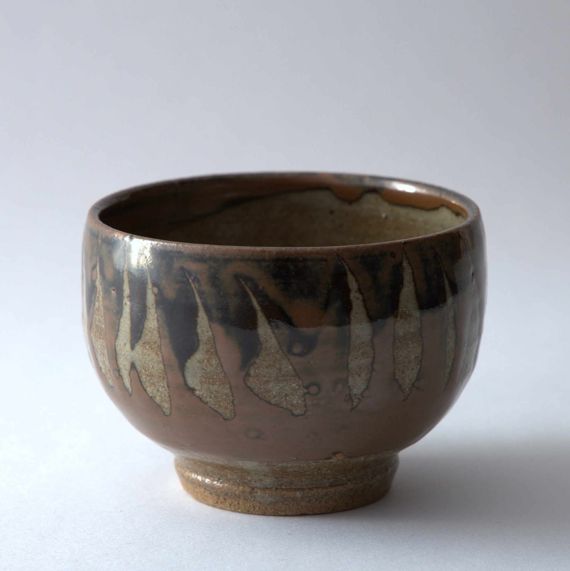 この作品には、大胆な杓掛け、重ねがけの化粧土、指描きによるリズムなど、彼を象徴する釉薬技法が凝縮されており、炎と形が織りなす舞のような魅力が宿っている。